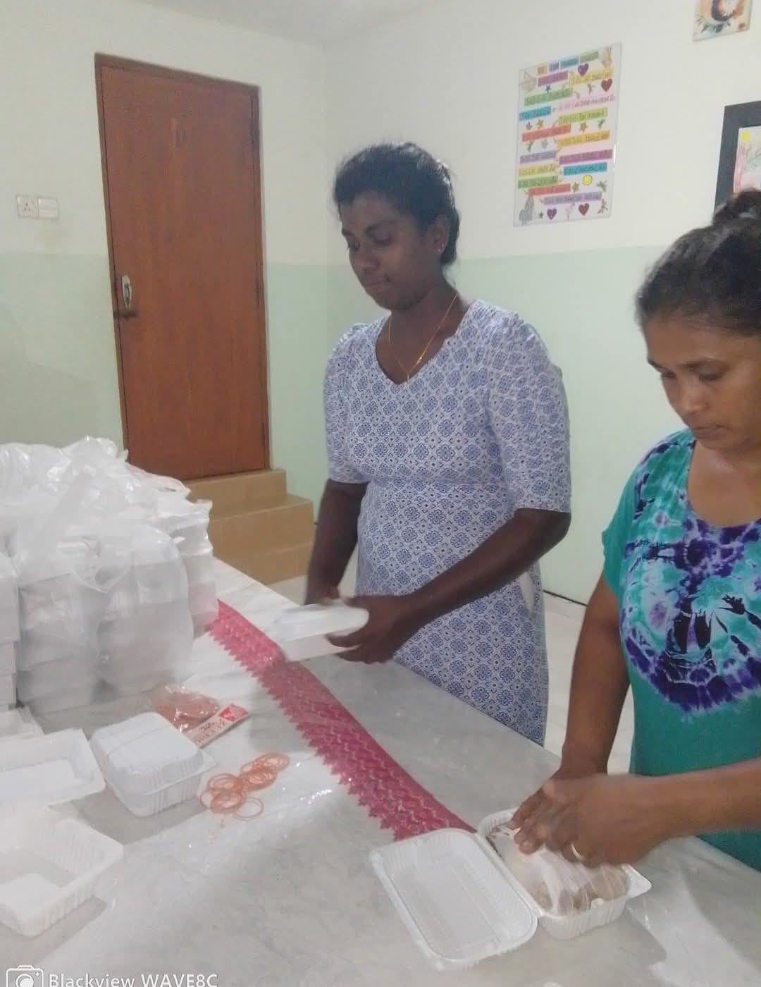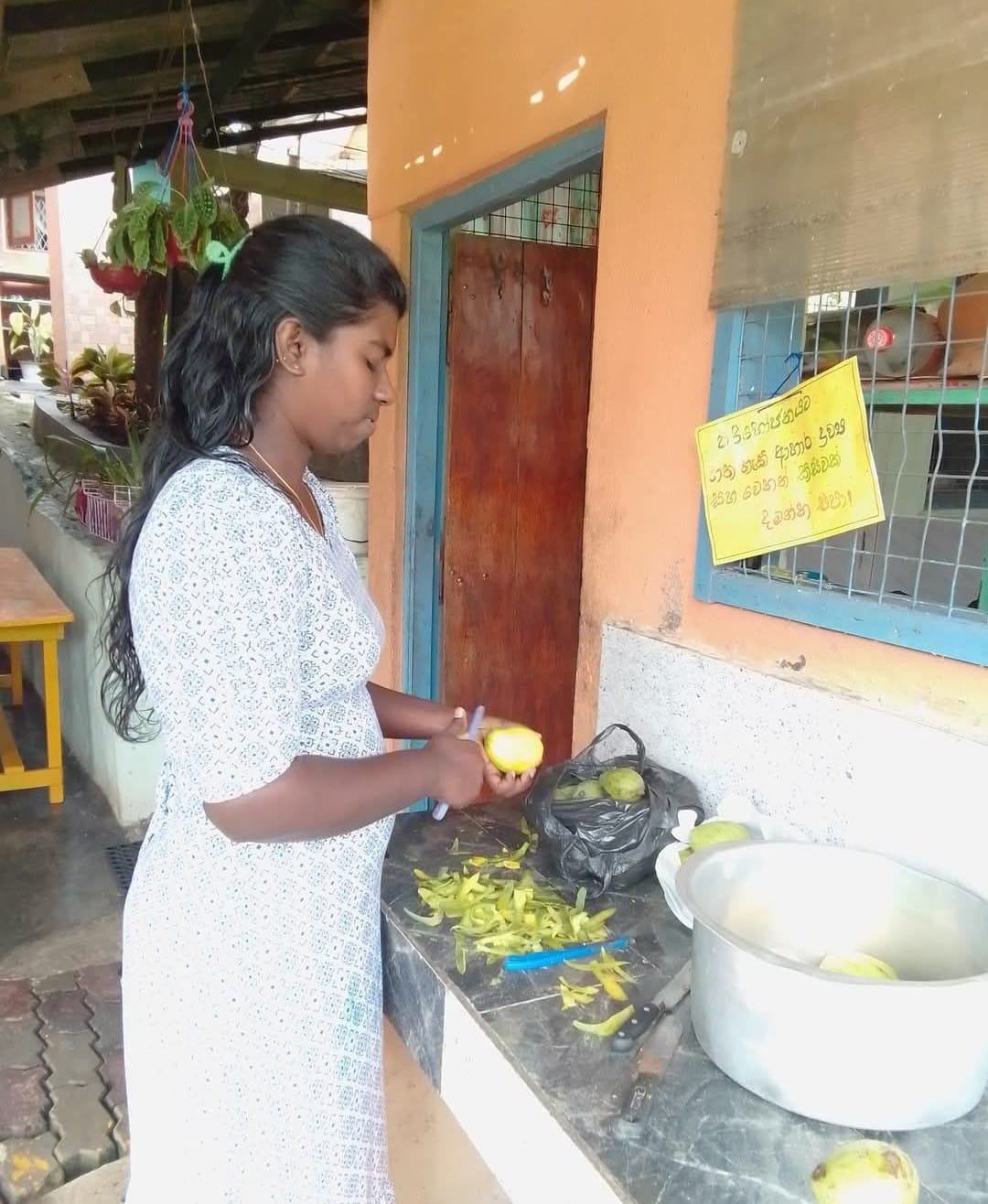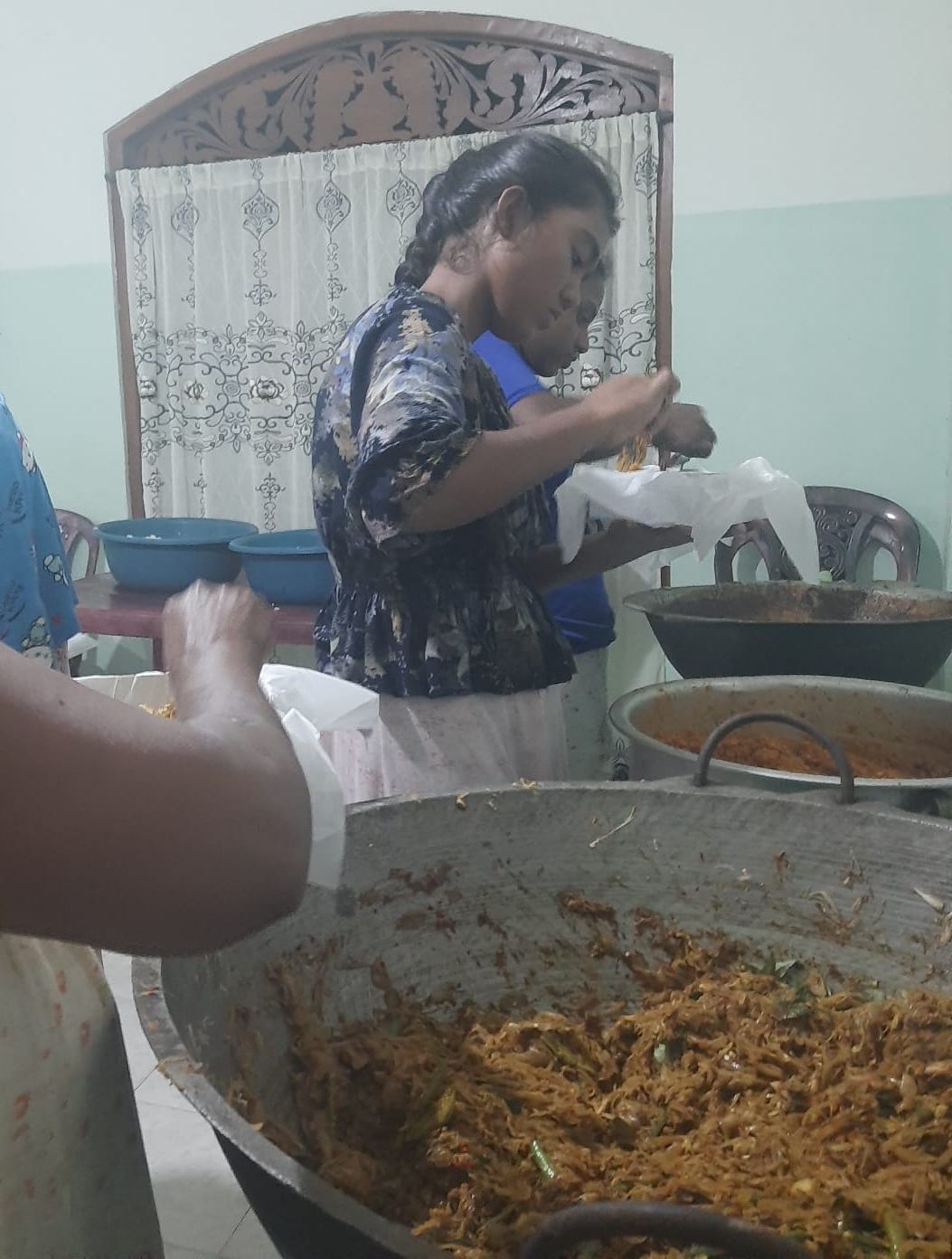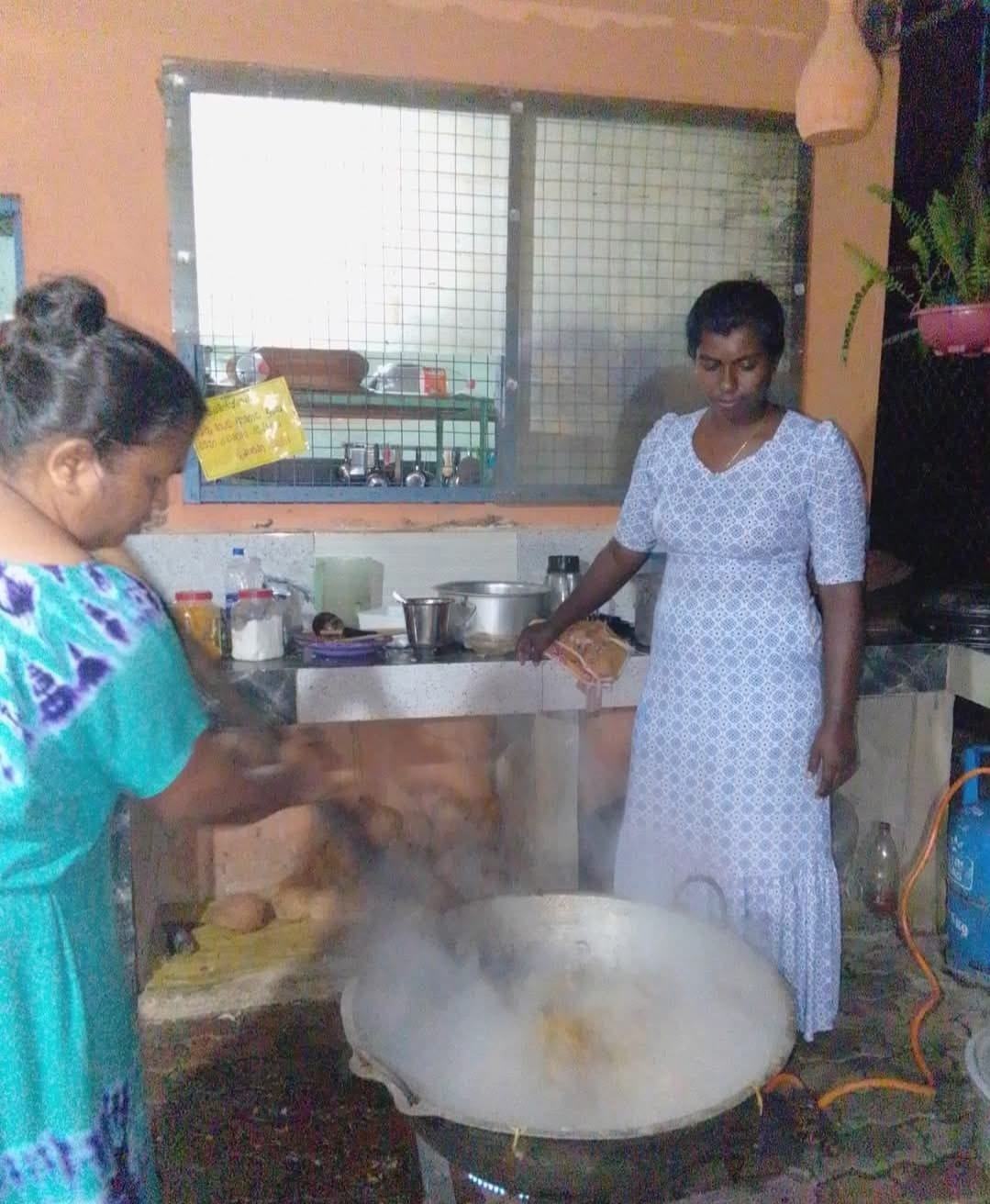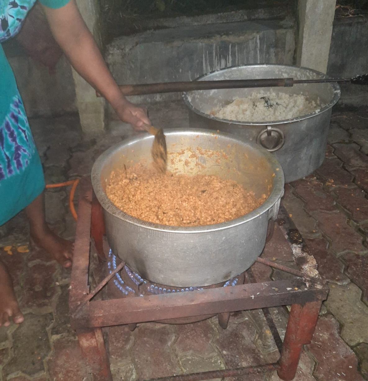Gleich haben unsere Betreuerinnen im Chathura-Kinderheim mit dem Kochen für die obdachlosen Überlebenden begonnen. Da die Schulen geschlossen sind, haben auch alle Mädchen fleißig mitgeholfen. Früh am Morgen wurden Unmengen Zwiebeln geschält, Reis, Fleisch und Gemüse gekocht und zu schmackhaftem Essen zubereitet. Die Kosten für diese Lebensmittel haben unsere vier Betreuerinnen Vinitha, Sewwandi, Kamani und Dhamika privat bezahlt. Unser Kinderheim-Projekt hat Trockenlebensmittel gespendet.