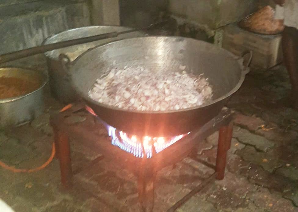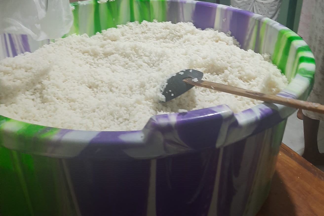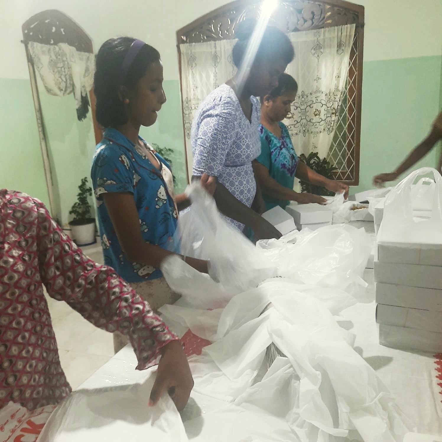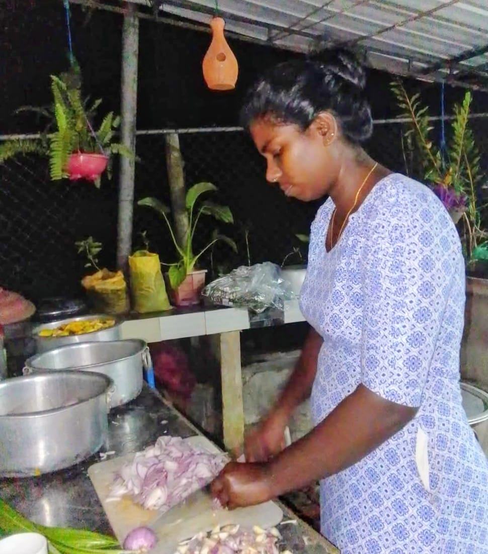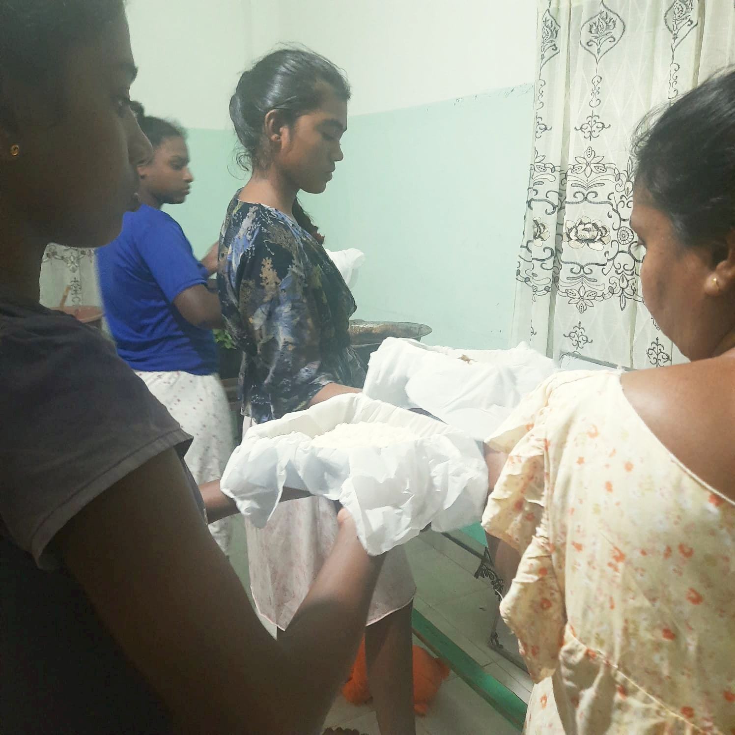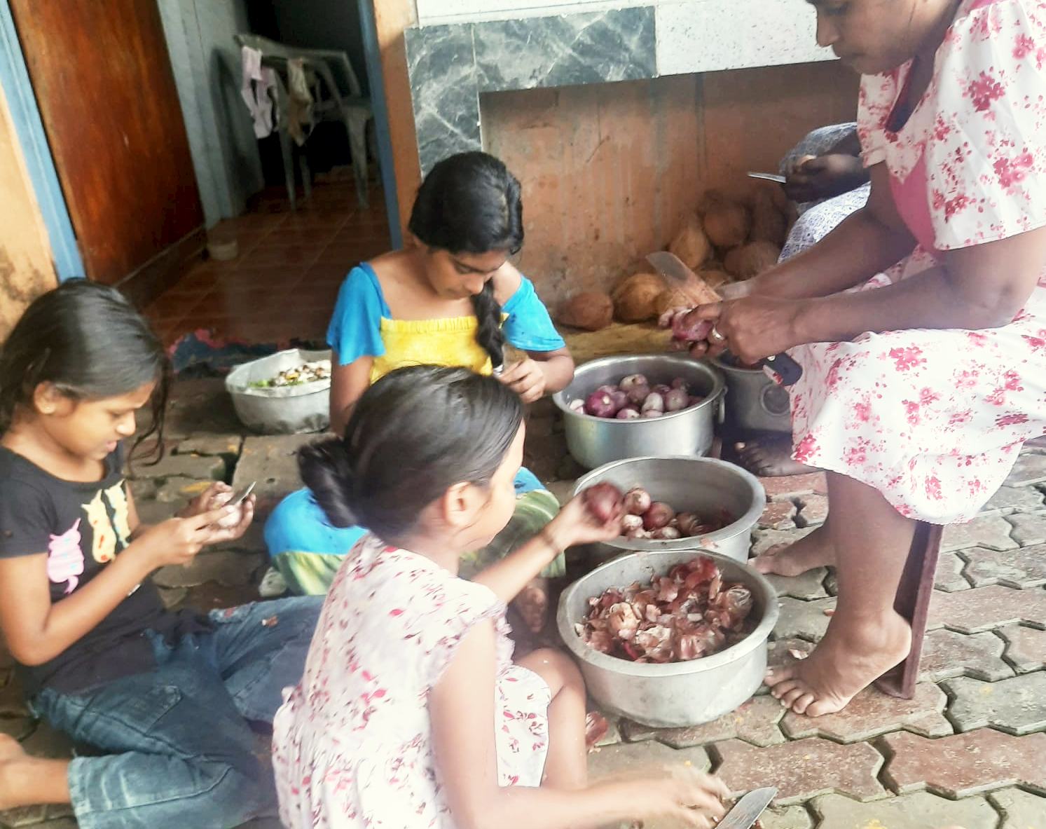 Gleich haben unsere Betreuerinnen im Chathura-Kinderheim mit dem Kochen für die obdachlosen Überlebenden begonnen. Da die Schulen geschlossen sind, haben auch alle Mädchen fleißig mitgeholfen. Früh am Morgen wurden Unmengen Zwiebeln geschält, Reis, Fleisch und Gemüse gekocht und zu schmackhaftem Essen zubereitet. Die Kosten für diese Lebensmittel haben unsere vier Betreuerinnen Vinitha, Sewwandi, Kamani und Dhamika privat bezahlt. Unser Kinderheim-Projekt hat Trockenlebensmittel gespendet.
